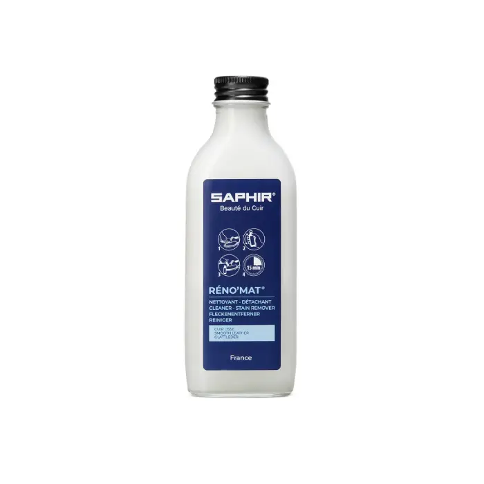 Réno’Mat limpia en profundidad el cuero liso, eliminando la suciedad y los depósitos de resina o silicona. Es un paso esencial antes de aplicar crema o betún para calzado, ya que abre los poros del cuero, permitiendo que los agentes nutritivos de los productos Saphir penetren en las capas más profundas. Esta hidratación profunda ayuda a prevenir que el cuero se agriete.